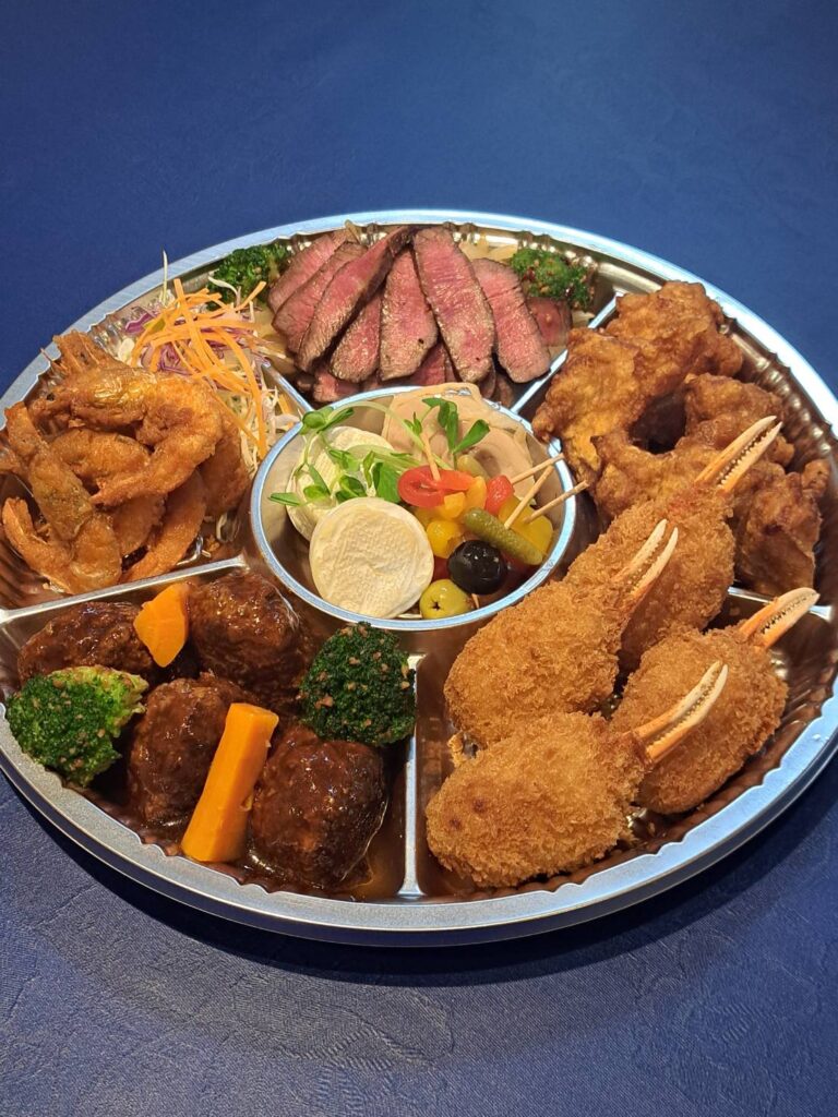 野菜のピクルス・生ハムのカマンベールチーズ包み+黒豆・伊達巻かまぼこ・フォアグラのテリーヌ+トリュフ・カブのテリーヌ イクラ添え・深谷牛サーロインのごぼう巻 筍添え・黒毛和牛ロースト・国産鶏もも蒸し・きのこマリネ